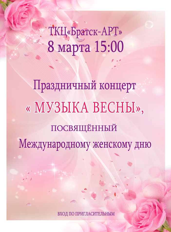 Самых любимых, самых нежных, самых дорогих! В Международный женский день в стенах ТКЦ «Братск-АРТ» творческие коллективы города поздравят милых дам.