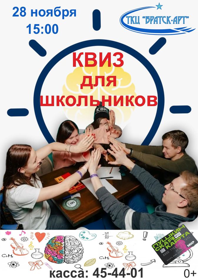 Участникам квиз-клуба в ТКЦ «Братск-АРТ» будет предложен увлекательный способ получения новых знаний и положительных эмоций, развития логики, мышления, памяти, формирования социальных навыков.