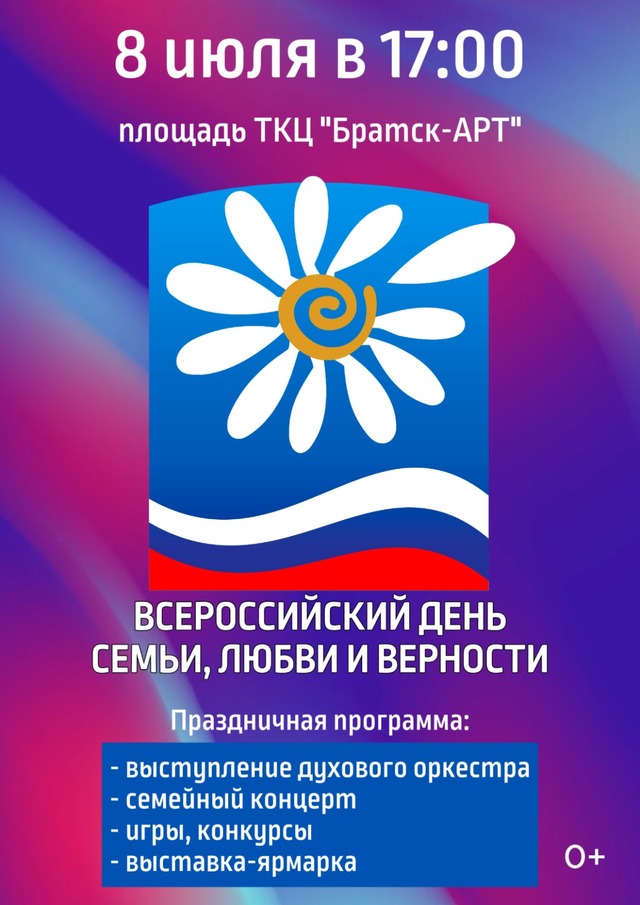 В этом году, 8 июля в 17:00 на площади ТКЦ «Братск-АРТ» состоится праздничный концерт, посвященный Дню семьи, любви и верности! Это прекрасная возможность собрать всю семью, отметить важные ценности и провести время в кругу близких людей.