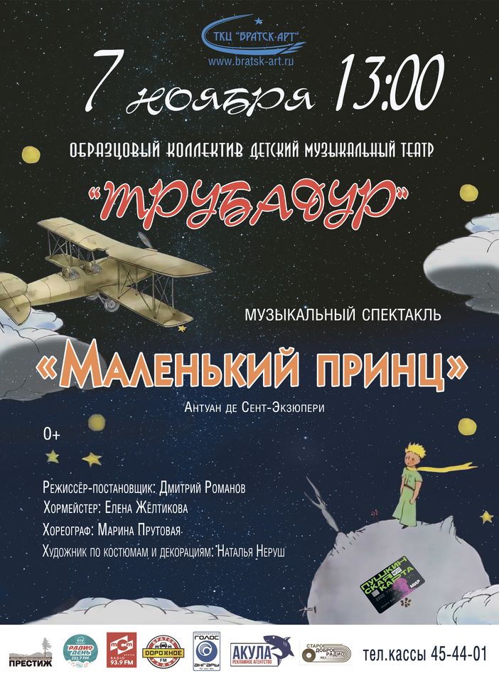 В музыкальном спектакле актеры театра «Трубадур» расскажут о Маленьком принце, который посещает различные планеты в космосе, включая землю, и обратятся к темам одиночества, дружбы, любви и потери.