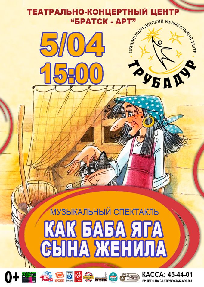 Спектакль детского музыкального театра «Трубадур» – это увлекательная и смешная история, основанная на русских народных сказках. В центре сюжета – известная всем бабушка, у которой есть заботливый, но немного неуклюжий сын. Баба Яга решает, что пора найти своему сыночку невесту.