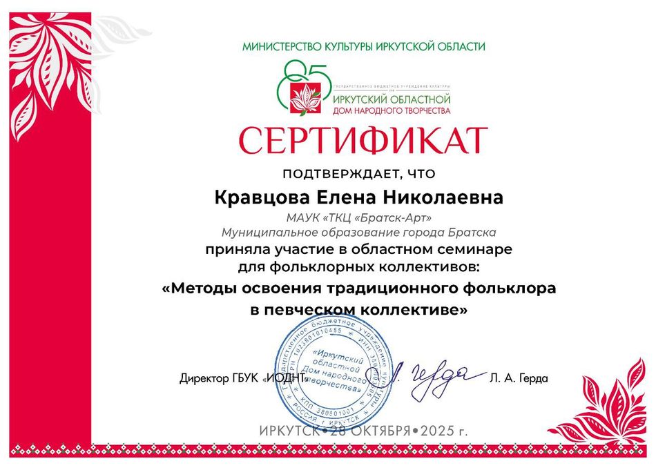 - Сертификат об участии в областном семинаре для народно-певческих коллективов «Методические и практические основы работы с народно-певческим коллективом», ГБУК «ИОДНТ» г. Иркутск, 2025 г.
