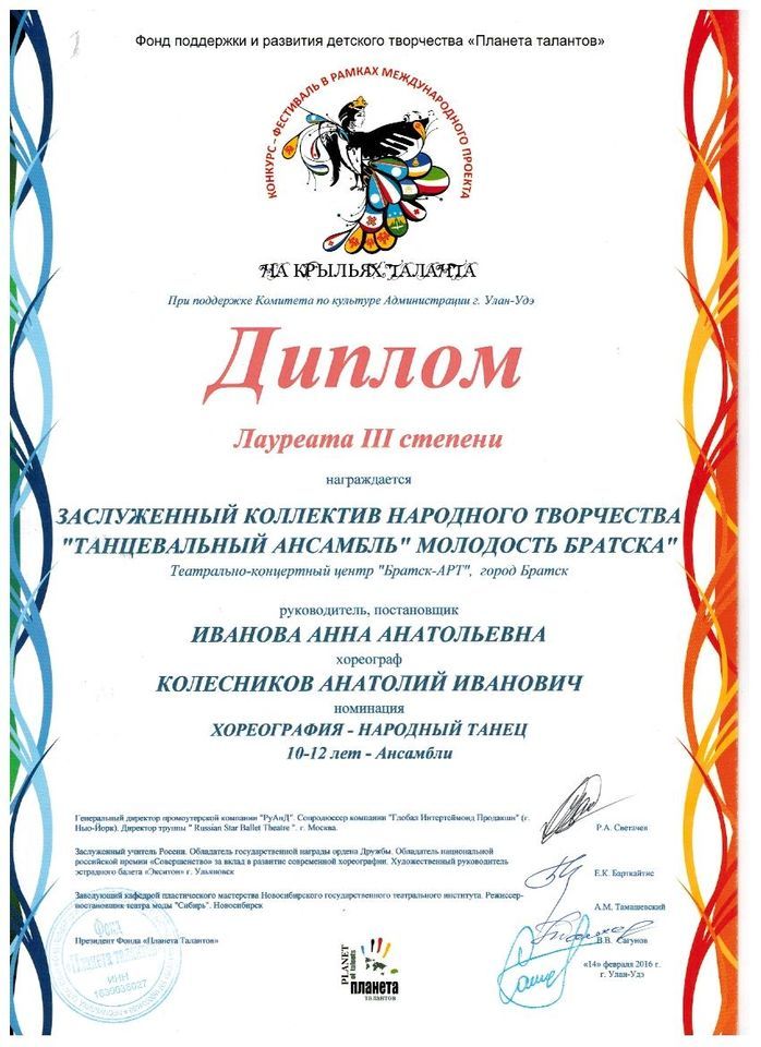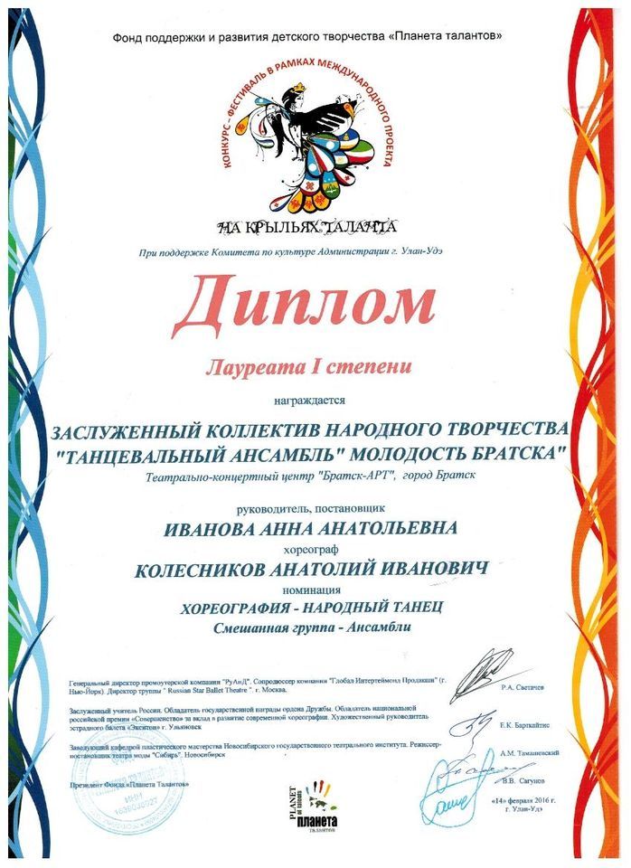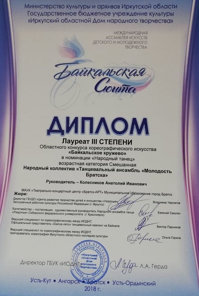 - Диплом Лауреата I степени VI Межрегионального хореографического конкурса-фестиваля «Байкальское Siяние» в номинации «Народный танец», возрастная группа 17-25 лет (номер «Горский пляс»), г. Братск