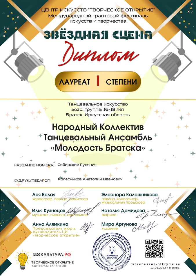 - диплом Лауреата I степени Международного хореографического конкурса «Сияй!» в номинации «Народный танец», возрастная группа 17+ (номер «Сибирские гуляния»), г. Новосибирск