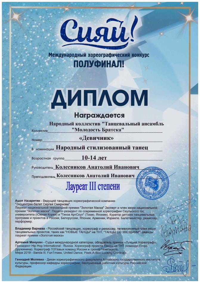 - диплом Лауреата III степени Международного хореографического конкурса «Сияй!» в номинации «Народно-стилизованный танец», возрастная группа 10-14 лет (номер «Девичник»), г. Новосибирск