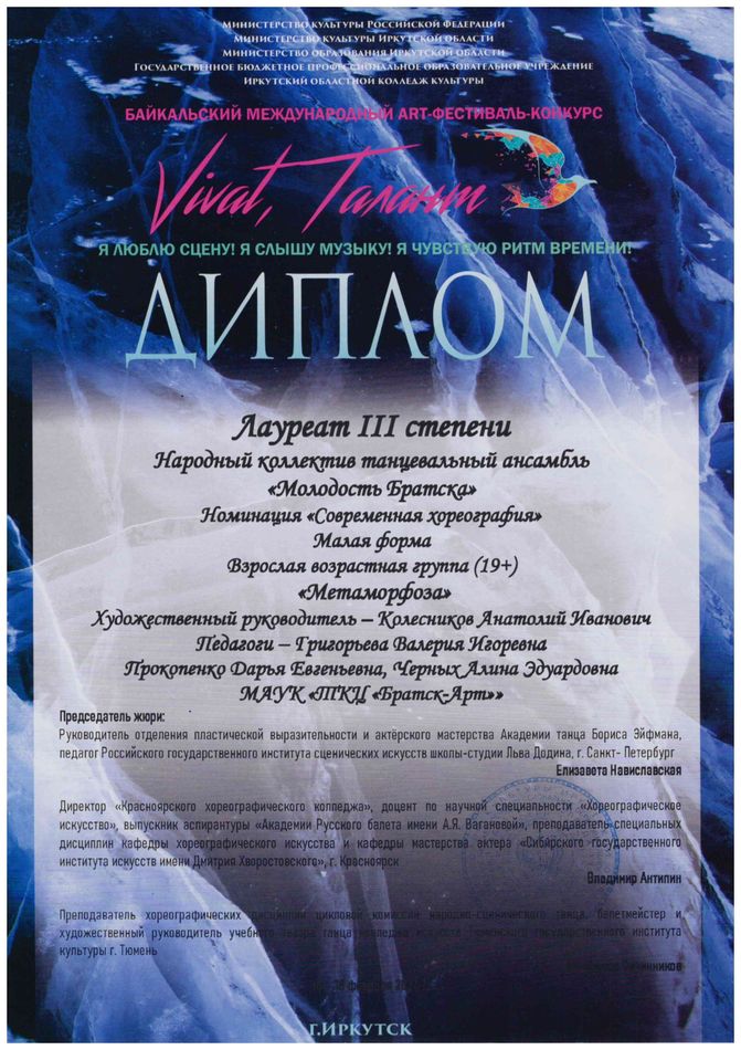 - диплом Лауреата III степени Байкальского международного ART-фестиваля-конкурса «Vivat, талант» в номинации «Современная хореография», возрастная группа 19+, номер «Метаморфозы», г. Иркутск