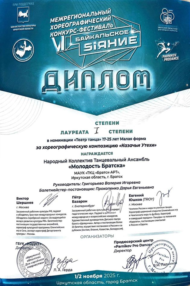 - Диплом Лауреата I степени VI Межрегионального хореографического конкурса-фестиваля «Байкальское Siяние», в номинации «Театр танца», возрастная группа 17-25 лет (номер «Казачьи утехи»), г. Братск