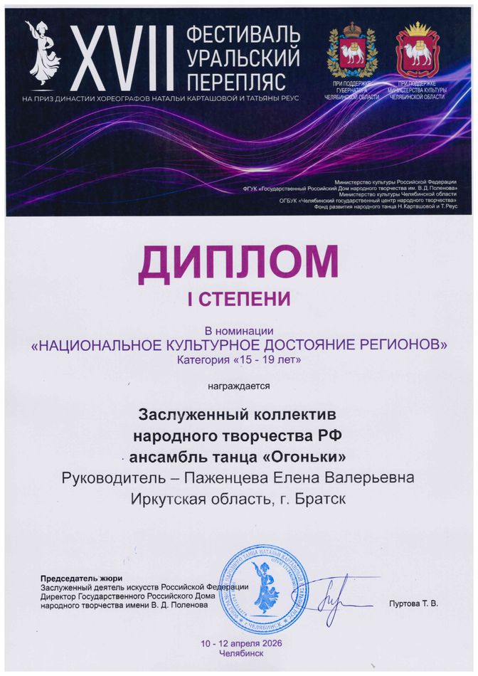 - диплом I степени XVII Всероссийского фестиваля-конкурса народного танца «Уральский перепляс» на приз династии хореографов Н. Карташовой и Т. Реус в номинации «Национальное культурное достояние регионов», возрастная группа 15-19 лет, г. Челябинск