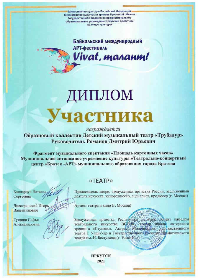 - диплом участника Байкальского Международного АРТ-фестиваля «Vivat, талант!» в номинации «Театр», г. Иркутск