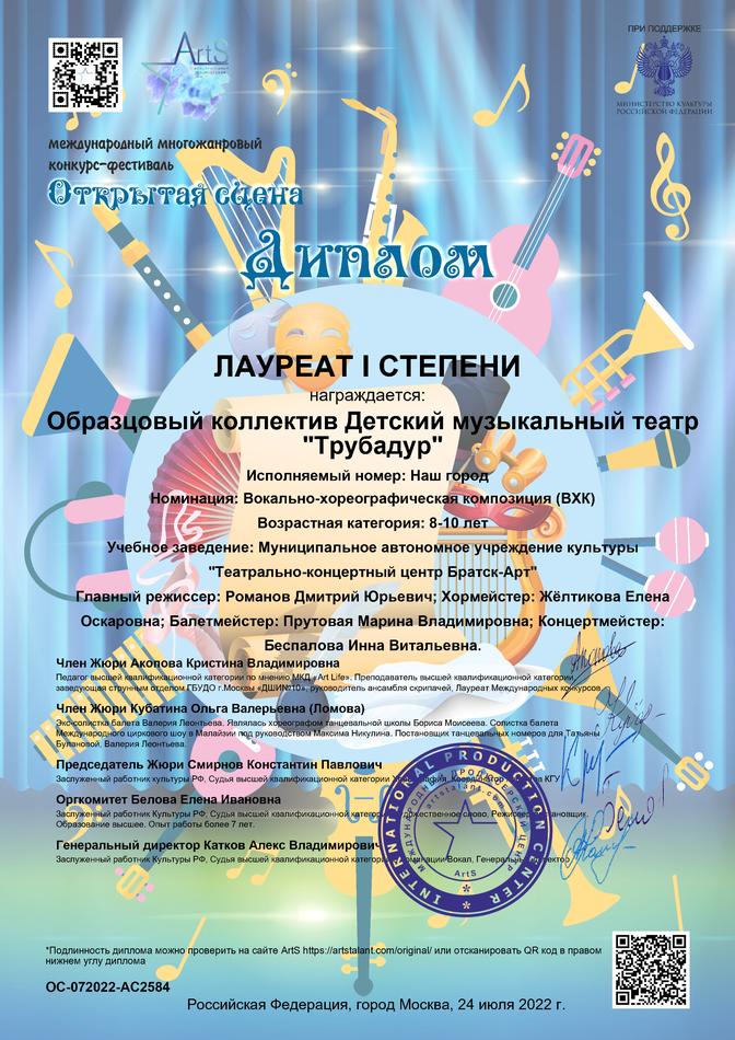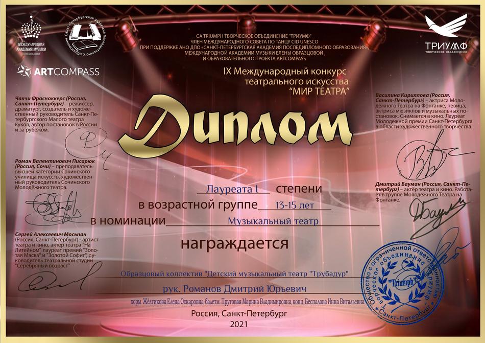 - диплом Лауреата I степени Международного заочного зарубежного конкурса-фестиваля исполнительского мастерства «Art Parig Fest» в номинации «Музыкальный театр», возрастная группа 14-16 лет, Франция, г. Париж