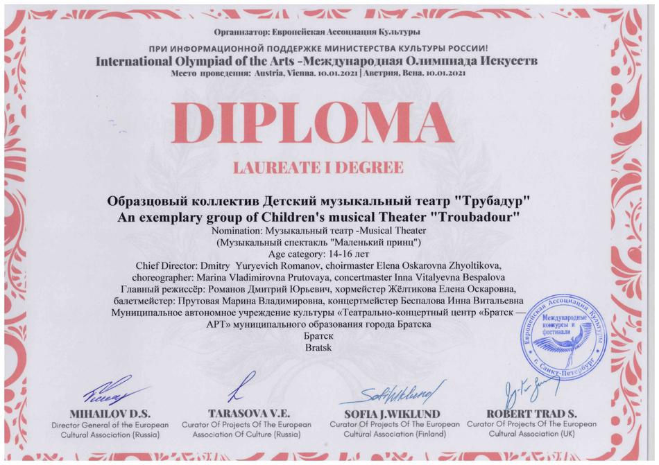 - диплом Лауреата I степени Международной Олимпиады Искусств в номинации «Музыкальный театр», возрастная группа 14-16 лет, Австрия, г. Вена