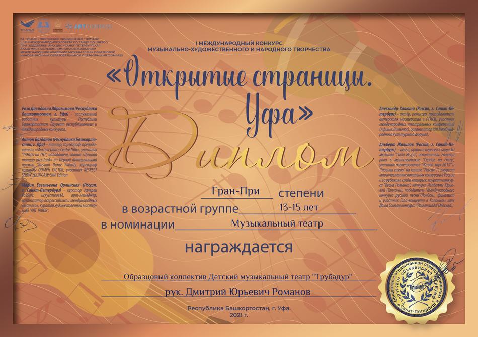 - диплом Гран-При I Международного конкурса музыкально-художественного и народного творчества «Открытые страницы. Уфа» в номинации «Музыкальный театр», возрастная группа 13-15 лет, республика Башкортостан, г. Уфа