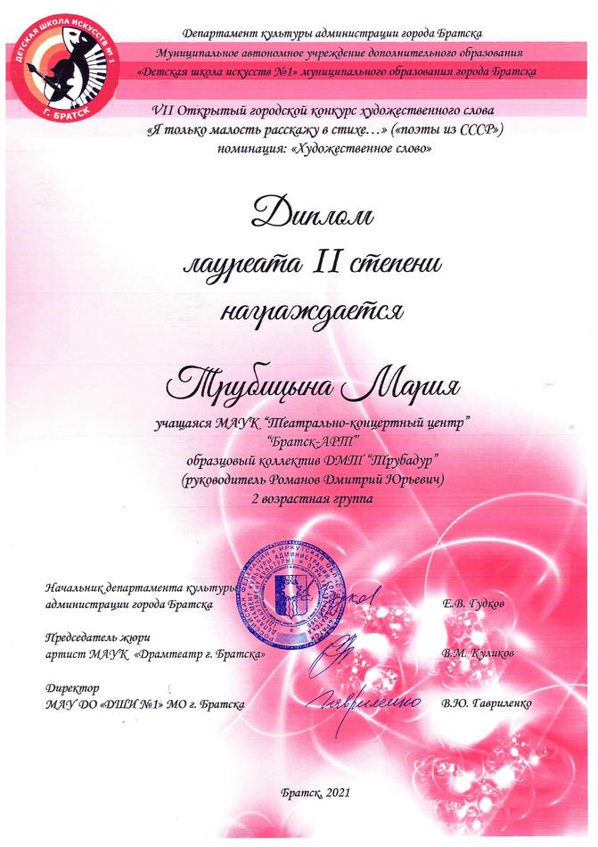 - диплом Лауреата II степени VII открытого городского конкурса художественного слова «Я только малость расскажу в стихе…» в номинации «Художественное слово», 2 возрастная группа, г. Братск