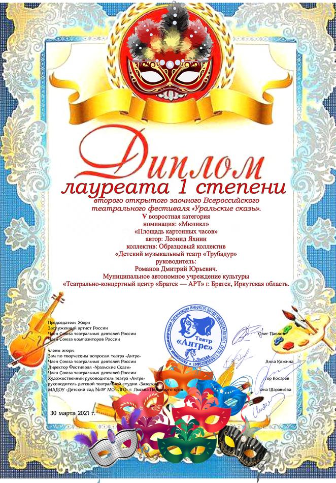 - диплом Лауреата I степени II открытого заочного Всероссийского театрального фестиваля «Уральские сказы» в номинации «Мюзикл», V возрастная категория, г. Лысьва