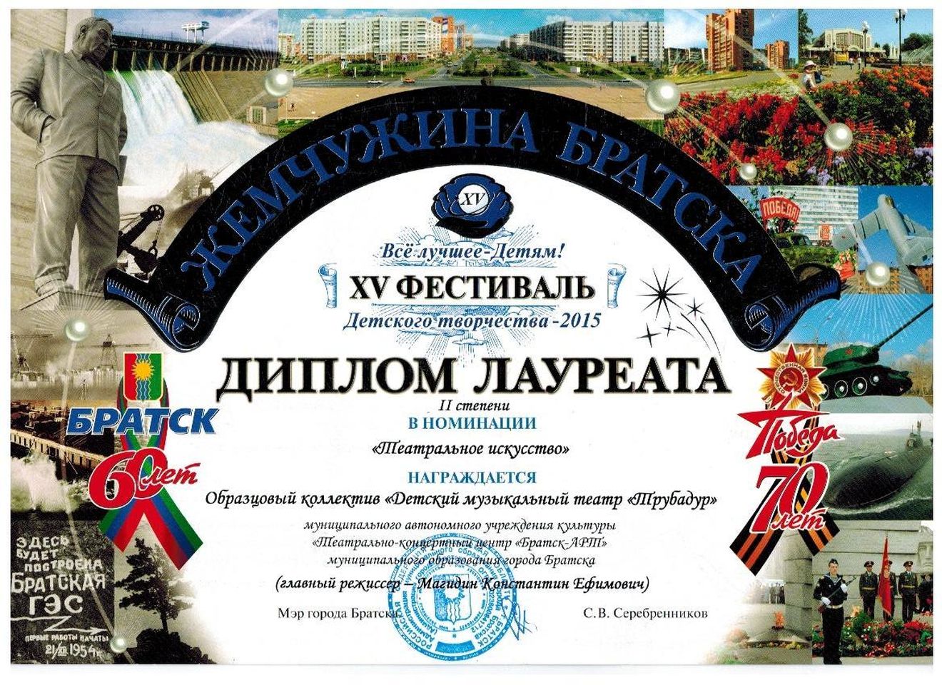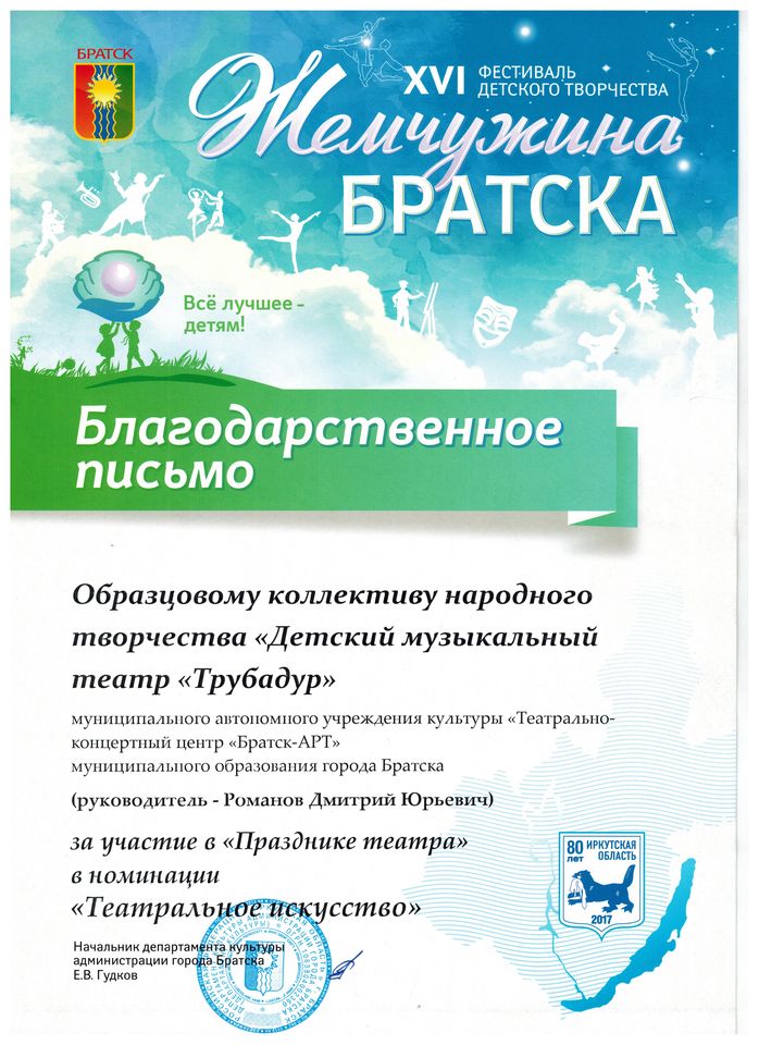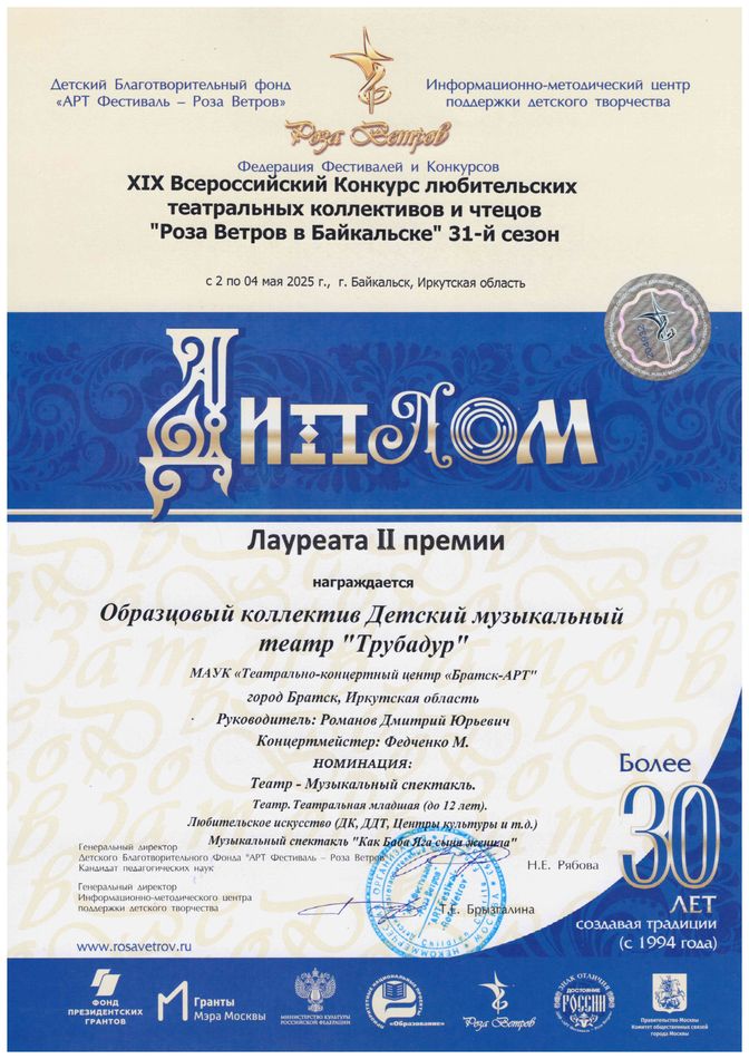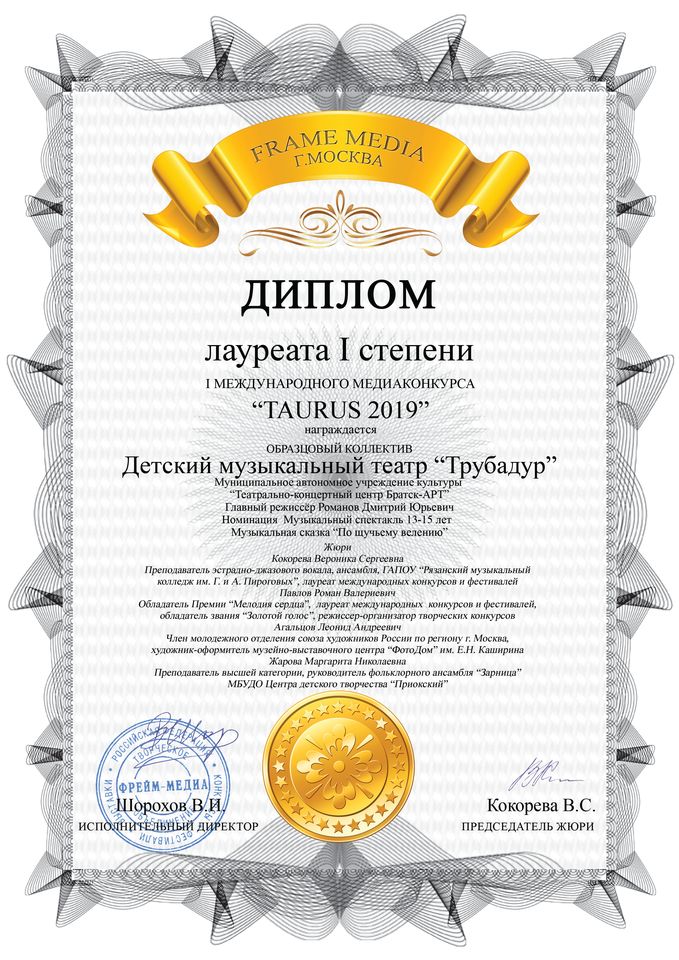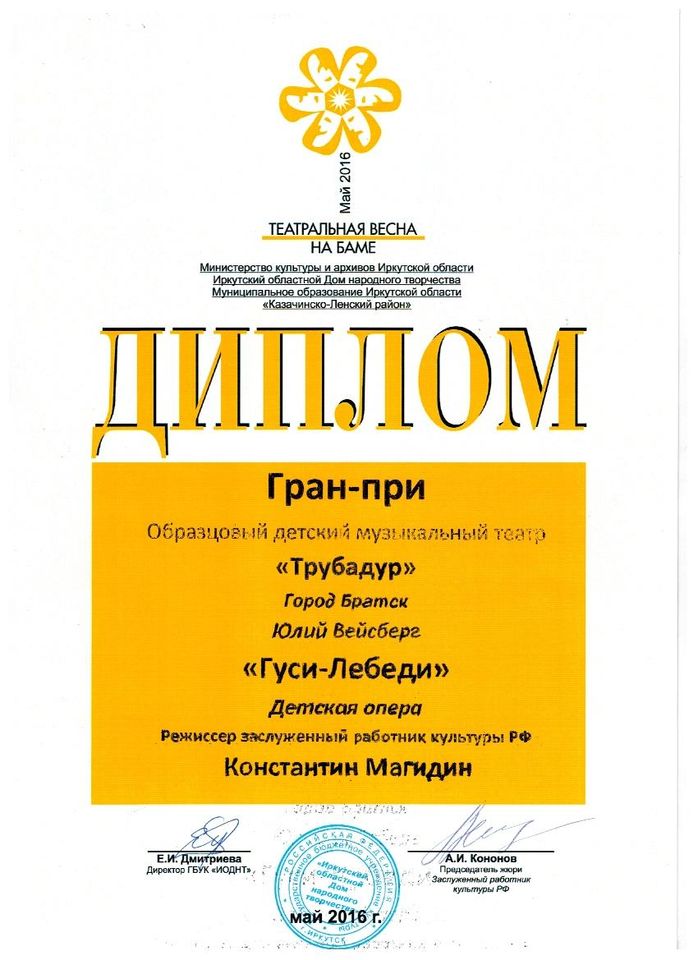 - диплом Погодаеву Алексею «За лучшую мужскую роль» Международного конкурса-фестиваля в рамках проекта «Сибирь зажигает звезды» в номинации «Театральный жанр-музыкальный театр», средний состав, г. Иркутск