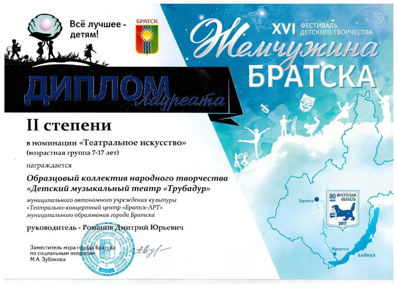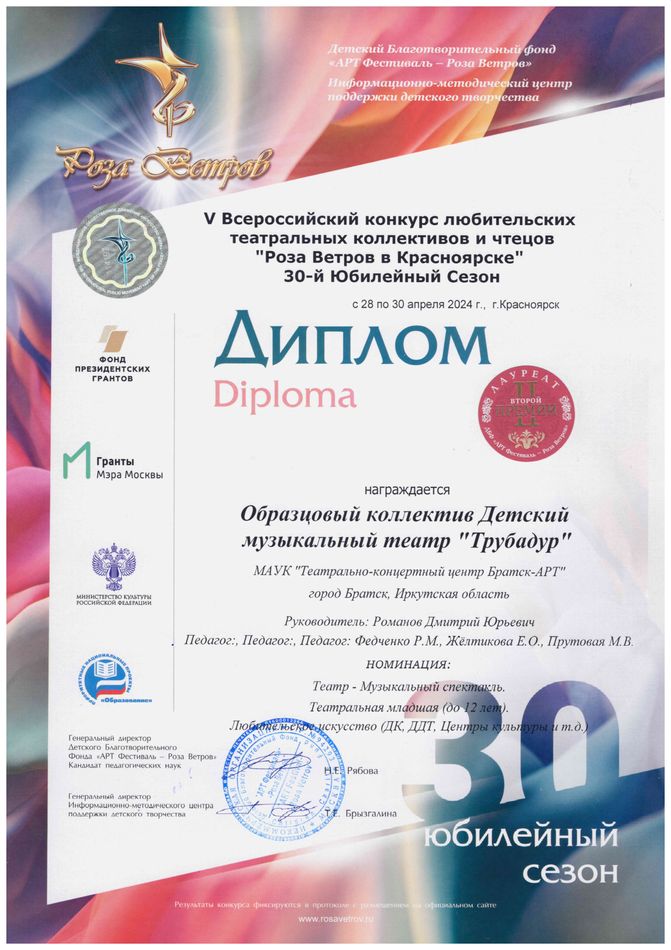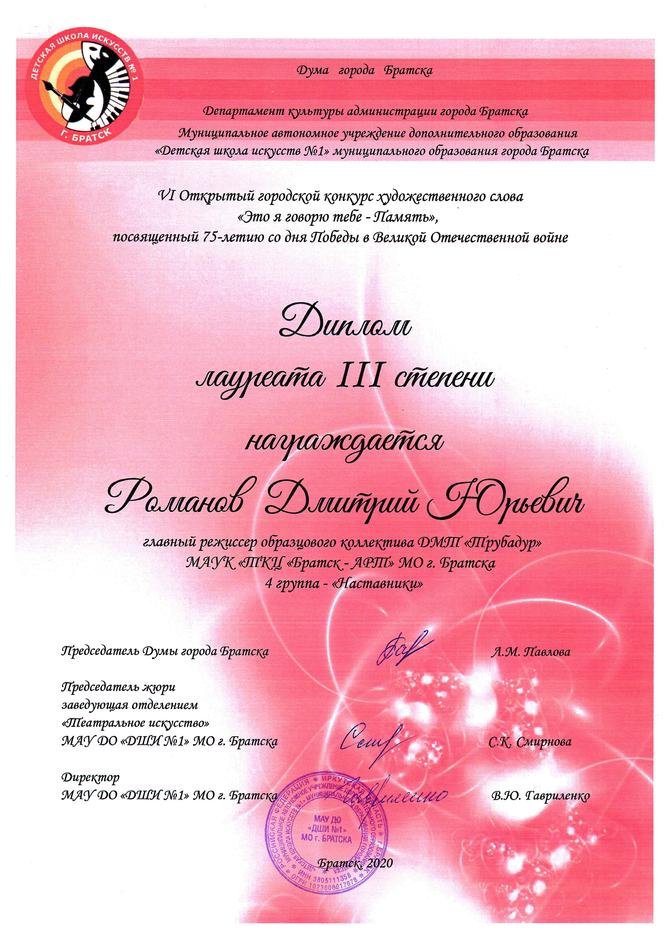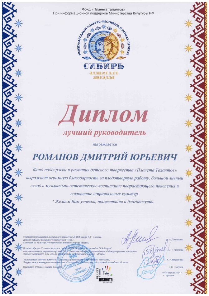 - диплом Романову Дмитрию Юрьевичу «Лучший руководитель» Международного конкурса-фестиваля в рамках проекта «Сибирь зажигает звезды» в номинации «Театральный жанр-музыкальный театр», средний состав, г. Иркутск