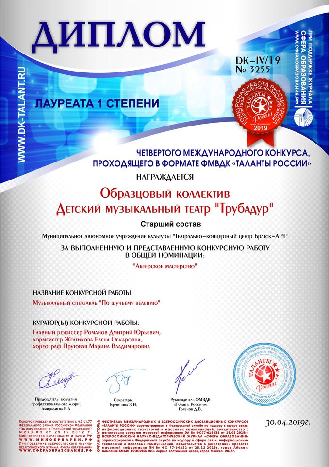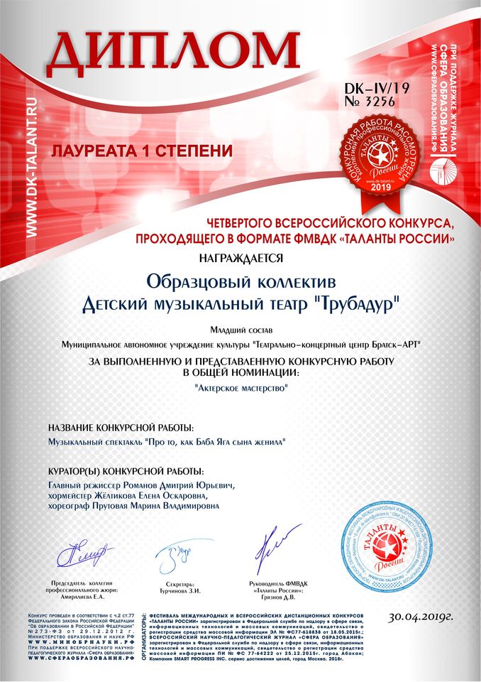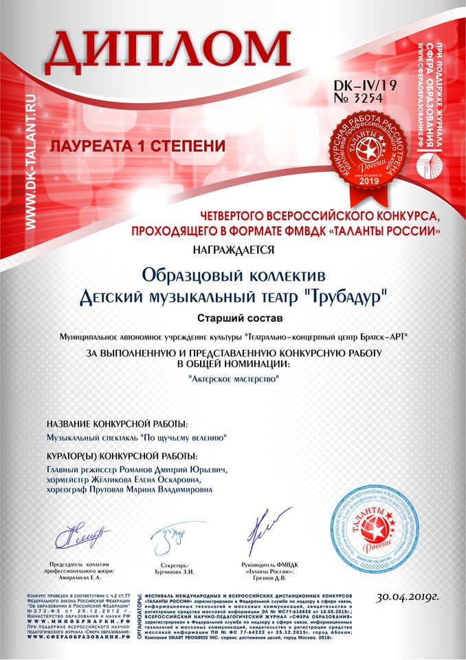 - диплом Лауреата I степени в номинации «Актерское мастерство» (старший состав), диплом Лауреата I степени в номинации «Актерское мастерство» (младший состав) четвертого Международного конкурса, проходящего в формате ФМВДК «Таланты России» (г. Абакан)