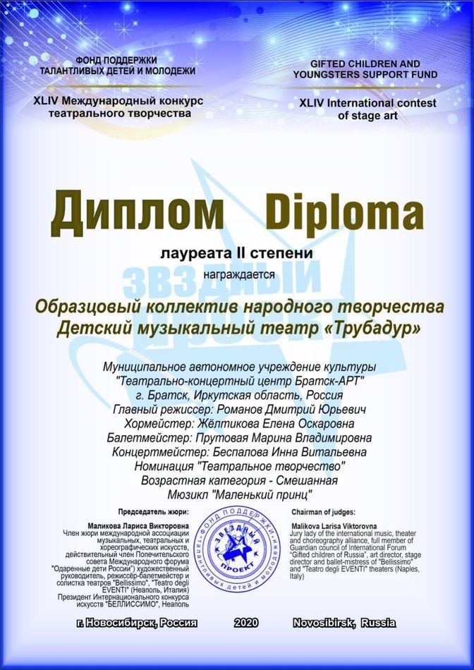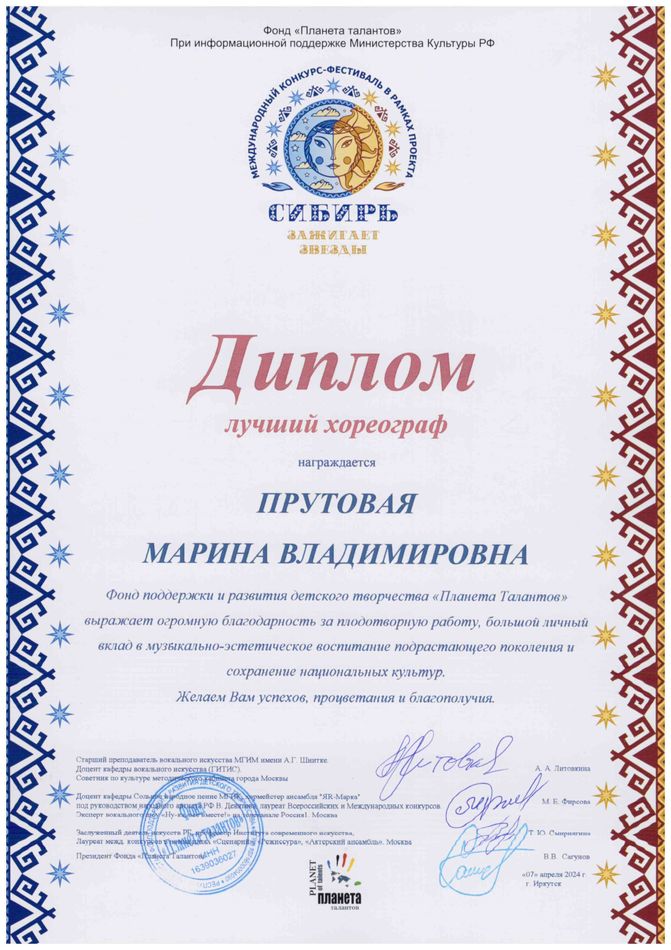 - диплом Прутовой Марине Владимировне «Лучший хореограф» Международного конкурса-фестиваля в рамках проекта «Сибирь зажигает звезды» в номинации «Театральный жанр-музыкальный театр», средний состав, г. Иркутск