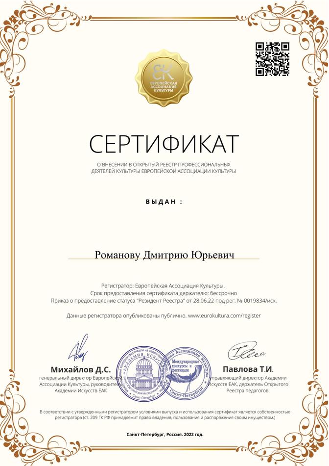 - г. Санкт-Петербург, июль 2022 г. - член Российского творческого союза работников культуры