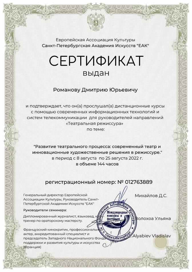 - г. Санкт-Петербург, август 2022 г. сертификат Европейской Ассоциации Культуры Санкт-Петербургская Академия Искусств "ЕАК"- дистанционные курсы для руководителей направлений "Театральная режиссура" по теме: "Развитие театрального процесса: современный театр и инновационные художественные решения в режиссуре" в объеме 144 часов, сертификат о внесении в открытый реестр профессиональных деятелей культуры ЕАК