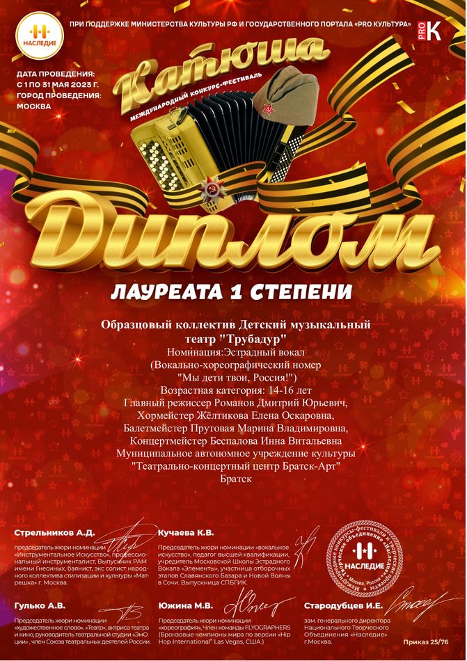 - диплом Лауреата I степени Международного конкурса-фестиваля «Катюша» в номинации «Эстрадный вокал» (вокально-хореографический номер «Мы дети твои, Россия!»), возрастная категория смешанная, г. Москва