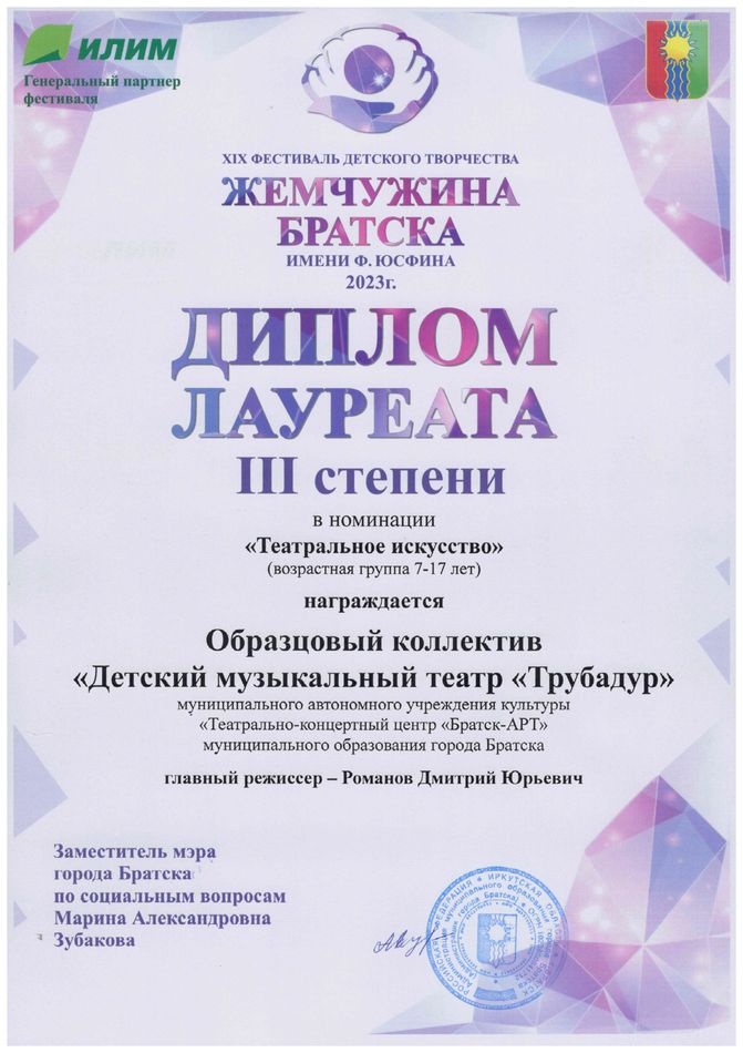 - диплом Лауреата III степени XIX Фестиваля детского творчества «Жемчужина Братска им. Ф. Юсфина» в номинации «Театральное искусство» (возрастная группа 7-17 лет), г. Братск