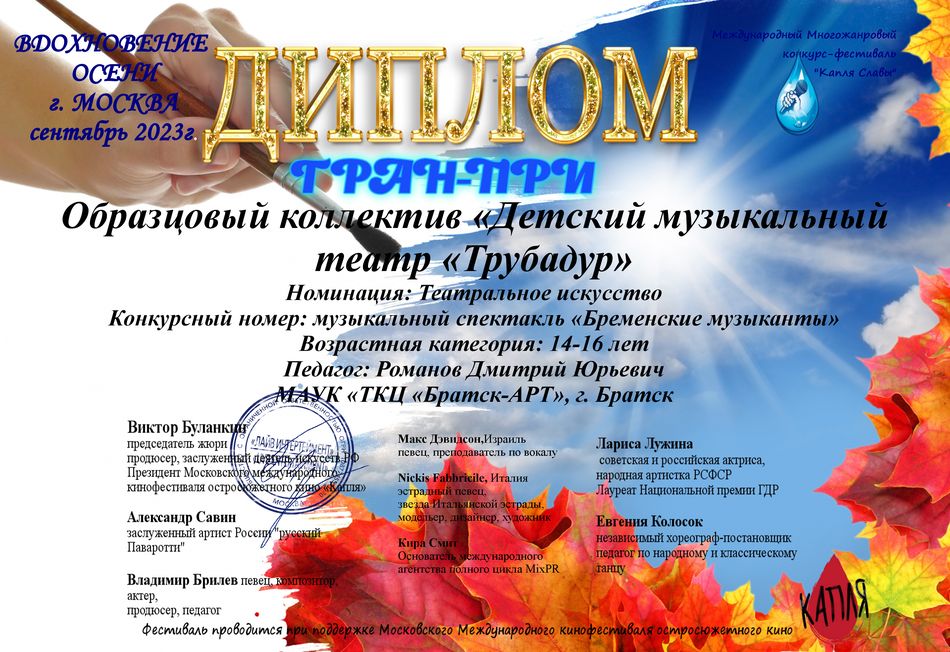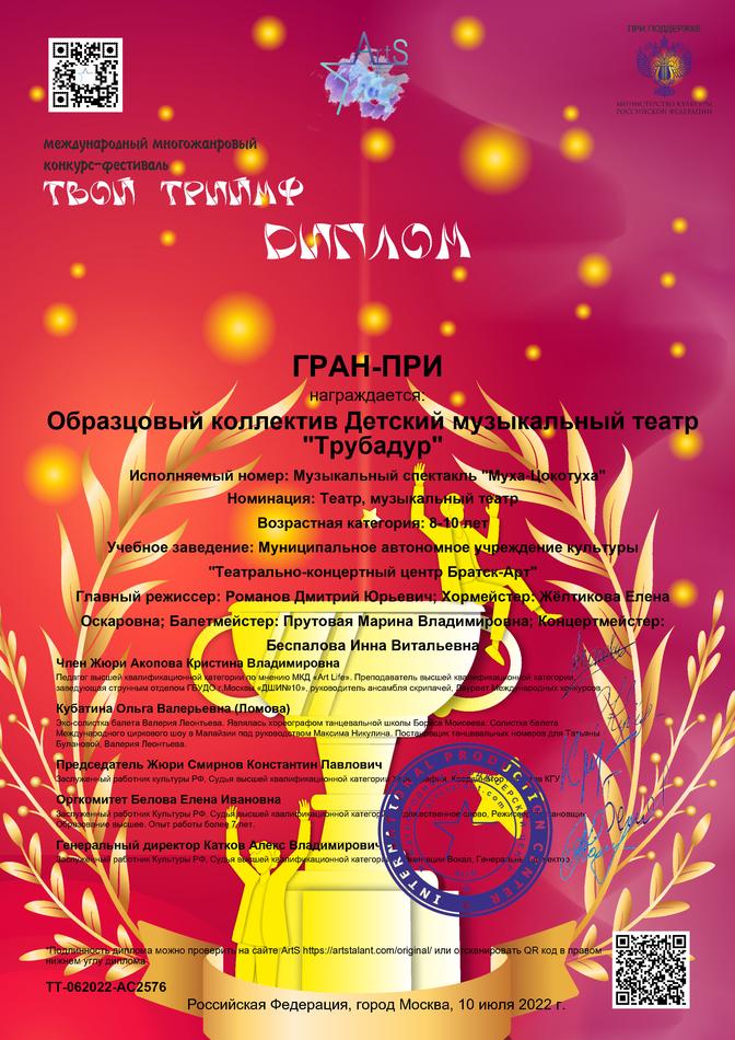 - диплом Гран-При Международного многожанрового конкурса-фестиваля «Твой триумф» в номинации «Театр, музыкальный театр», возрастная группа 8-10 лет, г. Москва