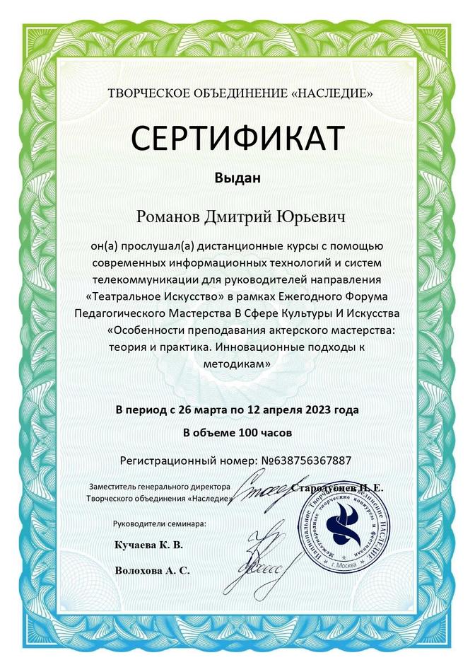 - г. Москва, 26 марта 2023 г - 12 апреля 2023 г. сертификат творческого объединения "Наследие" - дистанционные курсы с помощью современных информационных технологий и систем телекоммуникации для руководителей направления "Театральное Искусство" в рамках Ежегодного Форума Педагогического Мастерства В Сфере Культуры И Искусства "Особенности преподавания актерского мастерства: теория и практика. Инновационные подходы к методикам" в объеме 100 часов