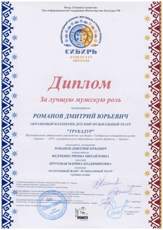- диплом Романову Дмитрию Юрьевичу «За лучшую мужскую роль» Международного конкурса-фестиваля в рамках проекта «Сибирь зажигает звезды» в номинации «Театральный жанр-музыкальный театр», средний состав, г. Иркутск