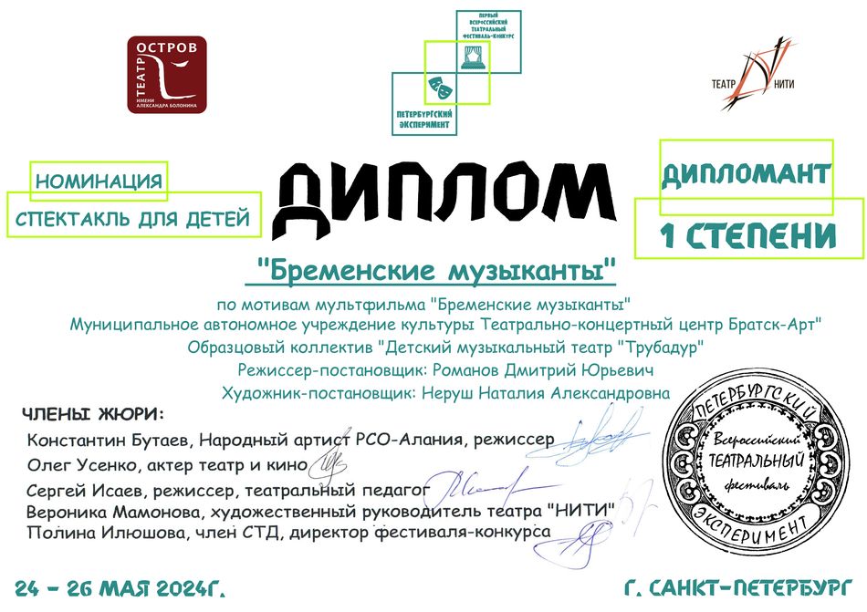 - диплом Дипломанта I степени Первого Всероссийского театрального конкурса-фестиваля «Петербургский эксперимент» в номинации «Спектакль для детей» (спектакль «Бременские музыканты»), г. Санкт-Петербург