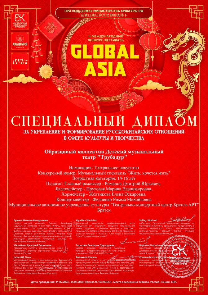 - специальный диплом II Международного конкурса-фестиваля «Global Azia» в номинации «Театральное искусство» (музыкальный спектакль «Жить…Хочется жить…»), возрастная группа 14-16 лет, г. Москва-Пекин