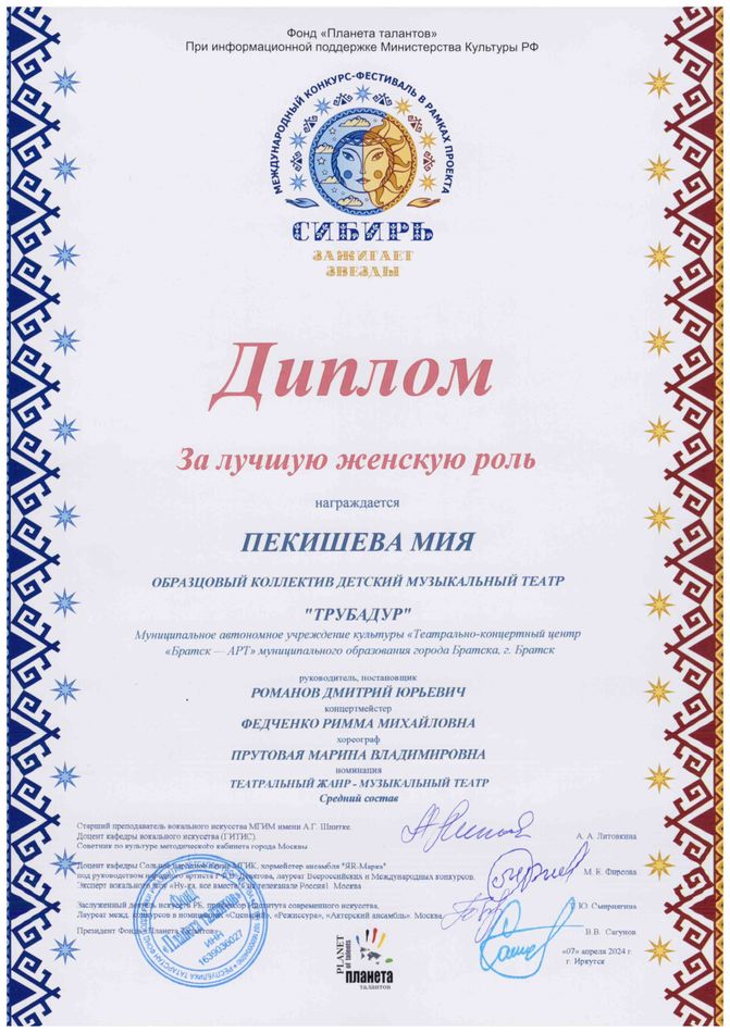 - диплом Пекишевой Мие «За лучшую женскую роль» Международного конкурса-фестиваля в рамках проекта «Сибирь зажигает звезды» в номинации «Театральный жанр-музыкальный театр», средний состав, г. Иркутск