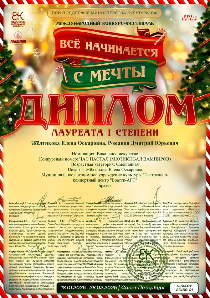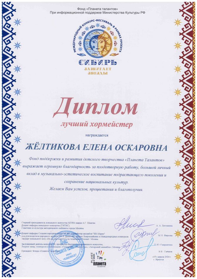 - диплом Желтиковой Елене Оскаровне «Лучший хормейстер» Международного конкурса-фестиваля в рамках проекта «Сибирь зажигает звезды» в номинации «Театральный жанр-музыкальный театр», средний состав, г. Иркутск