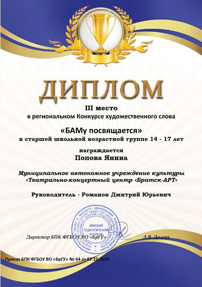 - диплом III место в региональном Конкурсе художественного слова «БАМу посвящается» в старшей школьной возрастной группе 14-17 лет, г. Братск