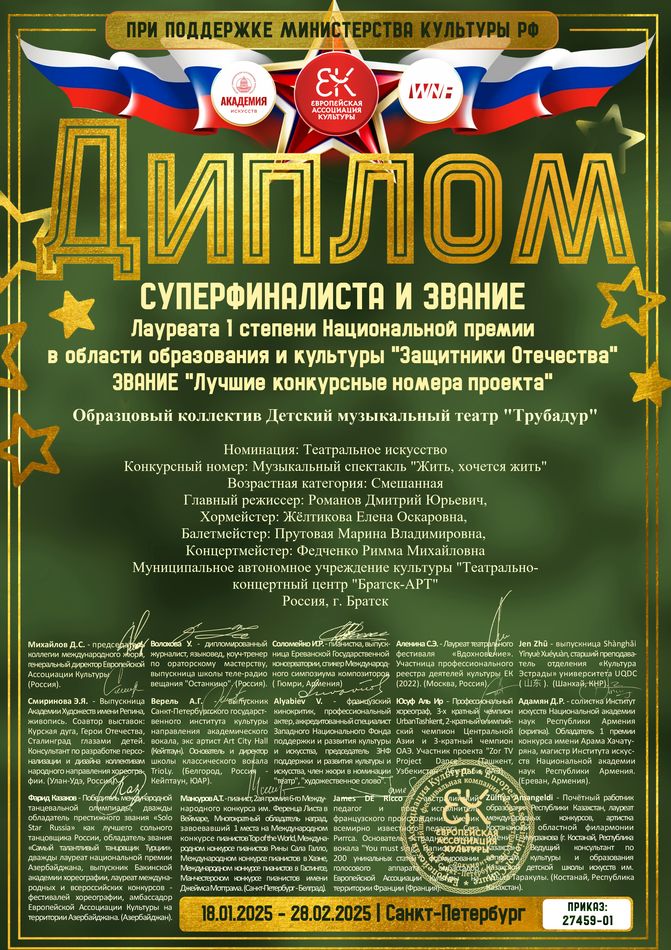 - диплом суперфиналиста и звание Лауреата I степени Национальной премии в области образования и культуры «Защитники Отечества», Звание «Лучшие конкурсные номера проекта» в номинации «Театральное искусство», возрастная группа смешанная, г. Санкт-Петербург