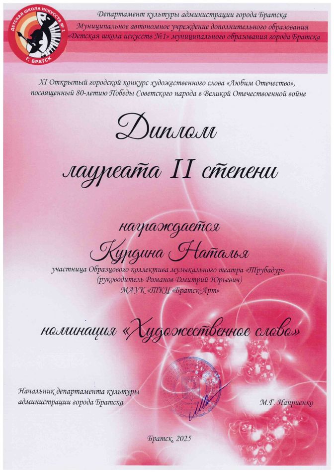 - диплом Лауреата II степени XI открытого городского конкурса художественного слова «Любим Отечество», посвященный 80-летию Победы Советского народа в Великой Отечественной войне (Курдина Наталья), г. Братск