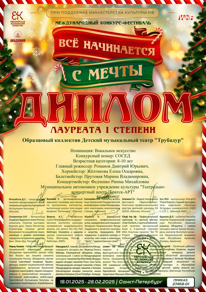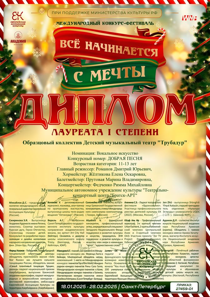 - диплом Лауреата I степени Международного конкурса-фестиваля «Всё начинается с мечты» в номинации «Вокальное искусство» (конкурсный номер «Наши дети»), возрастная группа смешанная, г. Санкт-Петербург