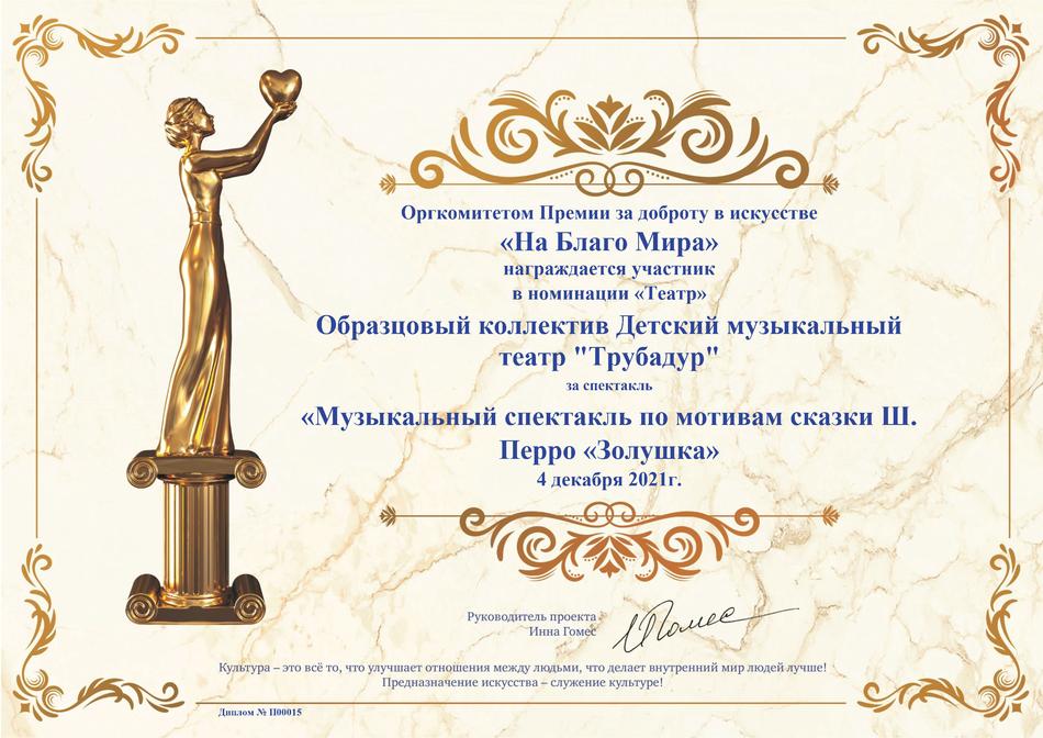 - диплом участника Премии за доброту в искусстве «На Благо Мира» в номинации «Театр» за музыкальный спектакль по мотивам сказки Ш. Перро «Золушка», г. Москва