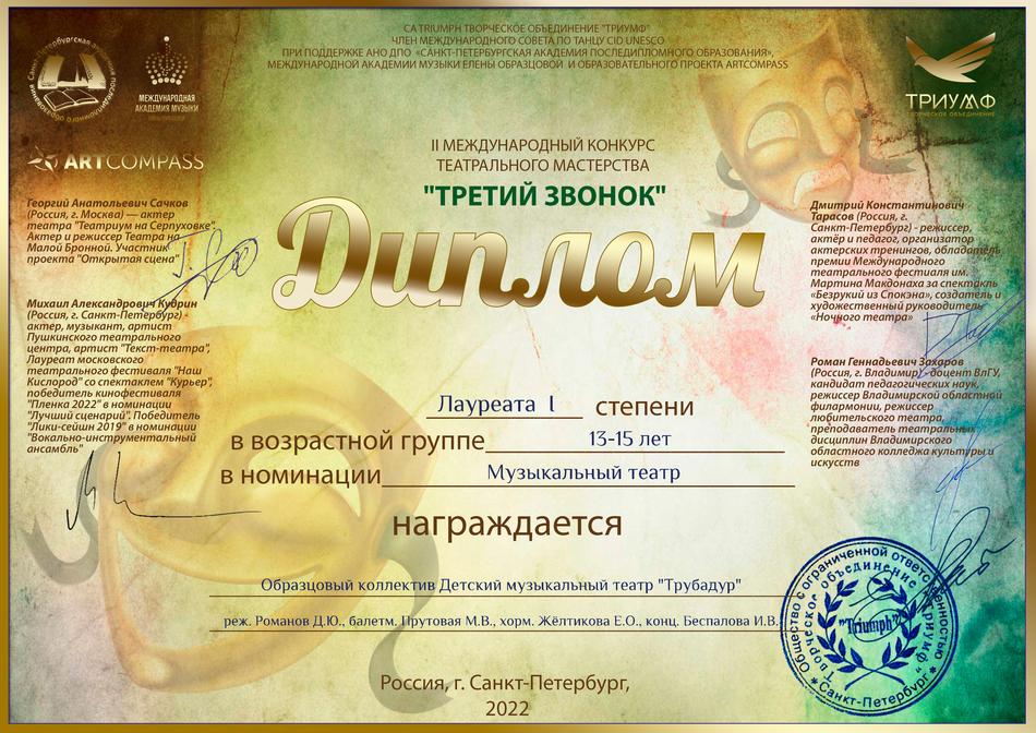 - диплом Лауреата I степени II Международного конкурса театрального мастерства «Третий звонок» в номинации «Музыкальный театр», возрастная группа 13-15 лет, г. Санкт-Петербург