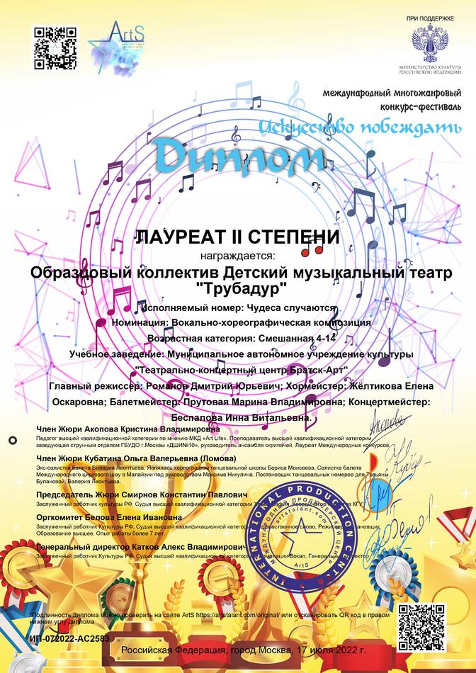 - диплом Лауреата II степени Международного многожанрового конкурса-фестиваля «Искусство побеждать» в номинации «Вокально-хореографическая композиция», возрастная группа 4-14 лет, г. Москва