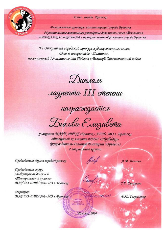 - диплом Лауреата III степени VI Открытого городского конкурса художественного слова «Это я говорю тебе, Память», 2 возрастная группа, г. Братск