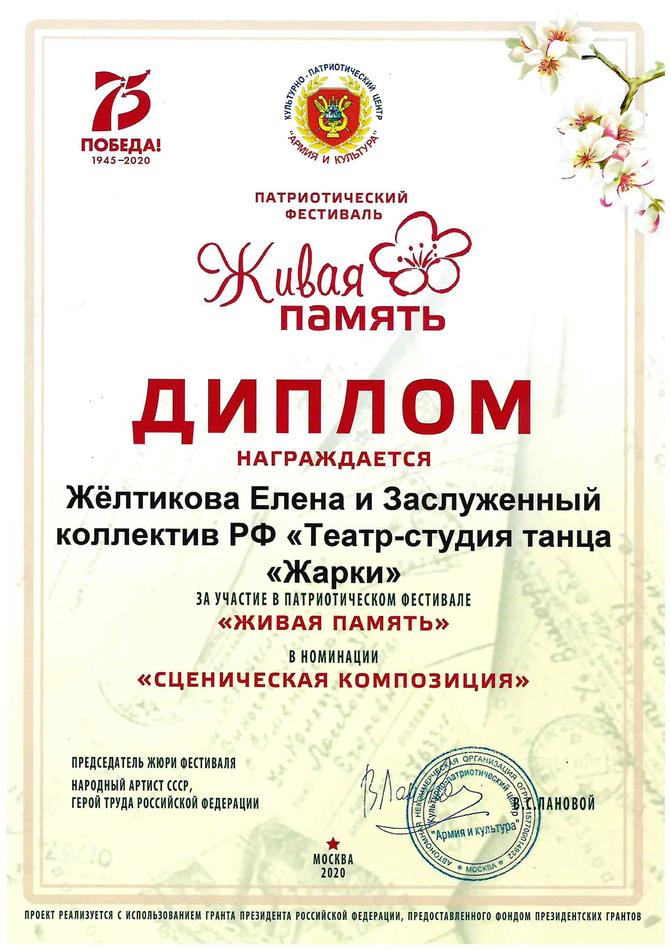 - диплом участника Патриотического фестиваля «Живая память» в номинации «Сценическая композиция», г. Москва
