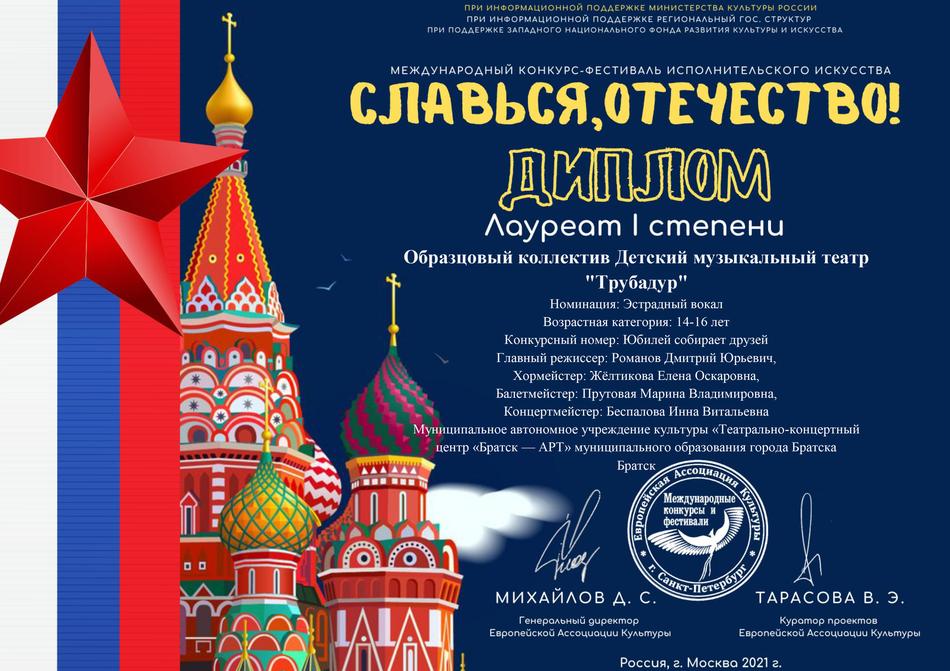 - диплом Лауреата I степени Международного конкурса-фестиваля исполнительского искусства «Славься, Отечество!» в номинации «Эстрадный вокал», возрастная группа 14-16 лет (конкурсный номер «Россия, мы дети твои!»), г. Москва