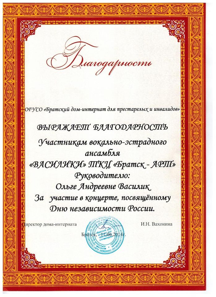- Благодарность ОГУСО «Братский дом-интернат для престарелых и инвалидов» (г. Братск)