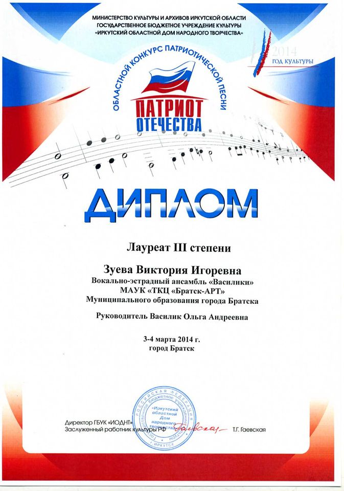 - диплом Лауреата III степени в номинации «Соло» областного конкурса патриотической песни «Патриот Отечества» (г. Братск)