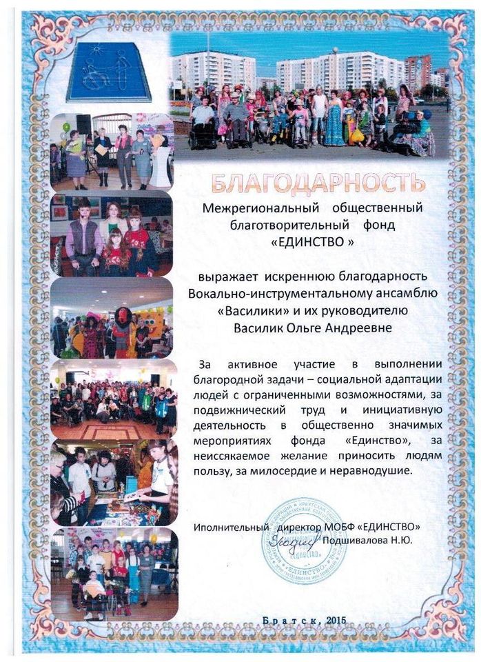 - благодарность межрегионального общественного благотворительного фонда «Единство» (г. Братск)