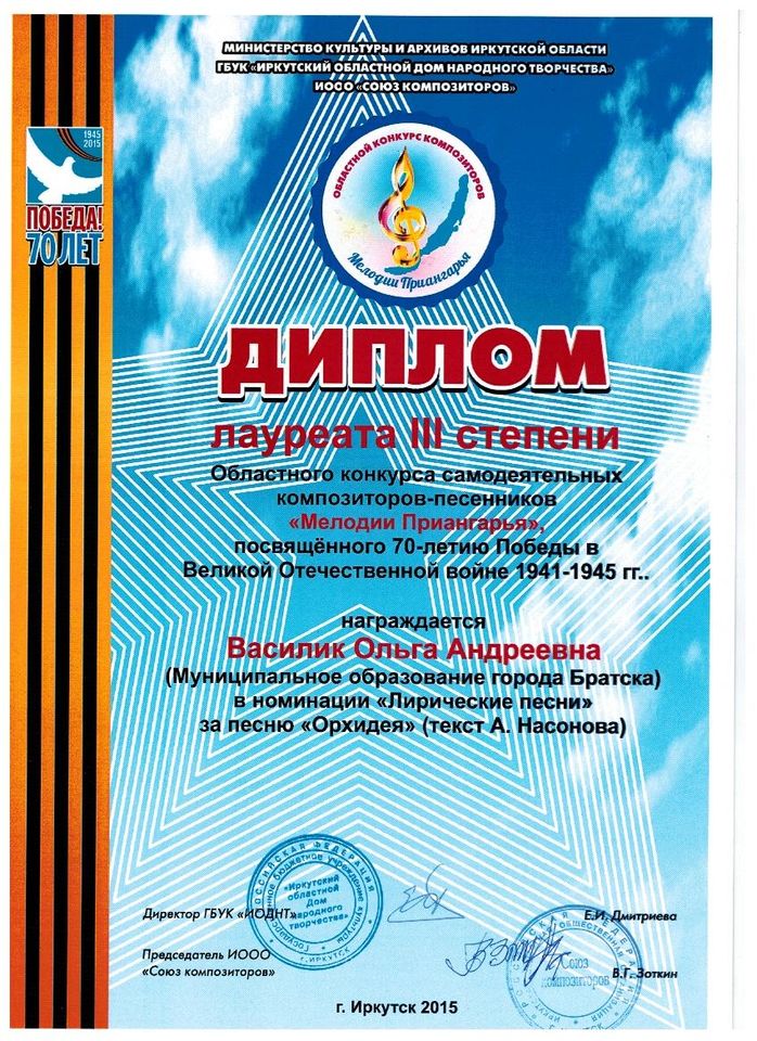- диплом Лауреата III степени в номинации «Песни гражданско-патриотической направленности» областного конкурса самодеятельных композиторов-песенников «Мелодии Приангарья» (г. Иркутск)