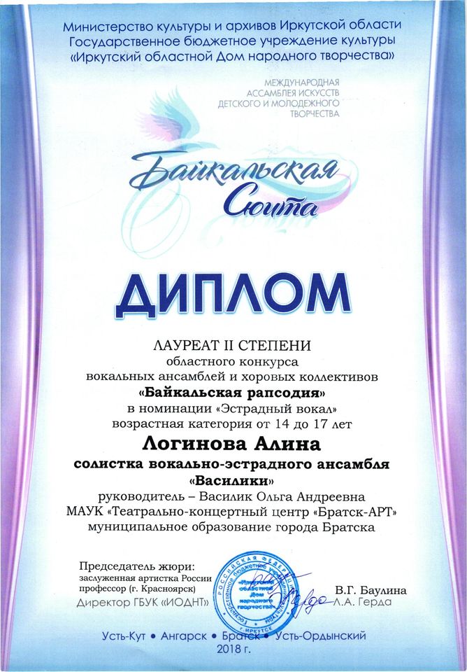 - диплом Лауреата II степени в номинации «Эстрадный вокал (от 14 до 17 лет)» областного конкурса вокальных ансамблей и хоровых коллективов «Байкальская рапсодия» в рамках Международной ассамблеи искусств детского и молодежного творчества «Байкальская сюита» (г. Братск)