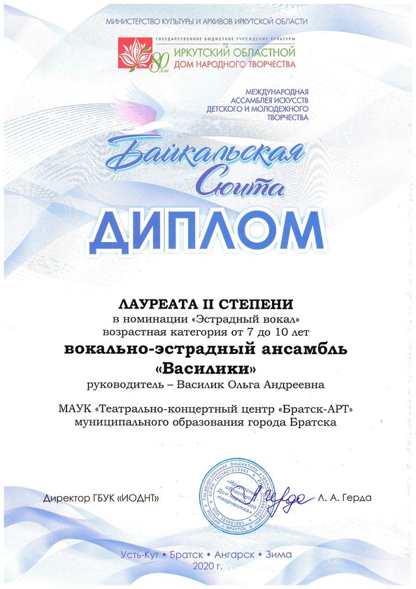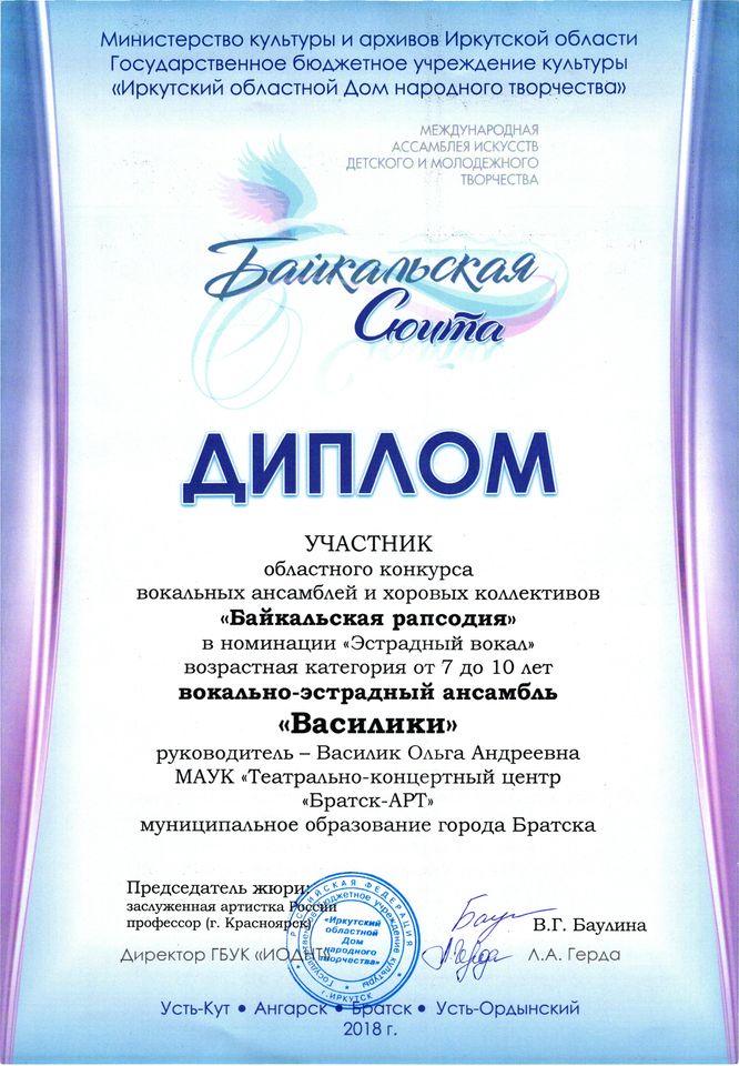 - диплом участника в номинации «Эстрадный вокал (от 7 до 10 лет)» областного конкурса вокальных ансамблей и хоровых коллективов «Байкальская рапсодия» в рамках Международной ассамблеи искусств детского и молодежного творчества «Байкальская сюита» (г. Братск)