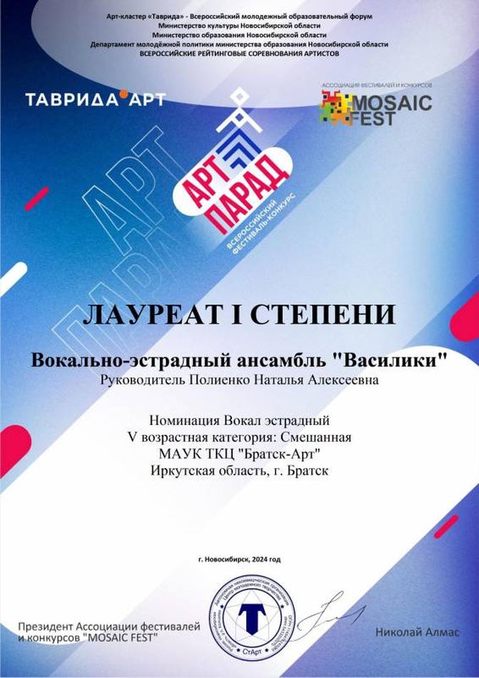 - диплом Лауреата I степени Всероссийского фестиваля-конкурса «АРТ-ПАРАД» в номинации «Вокал эстрадный», возрастная категория смешанная, г. Новосибирск